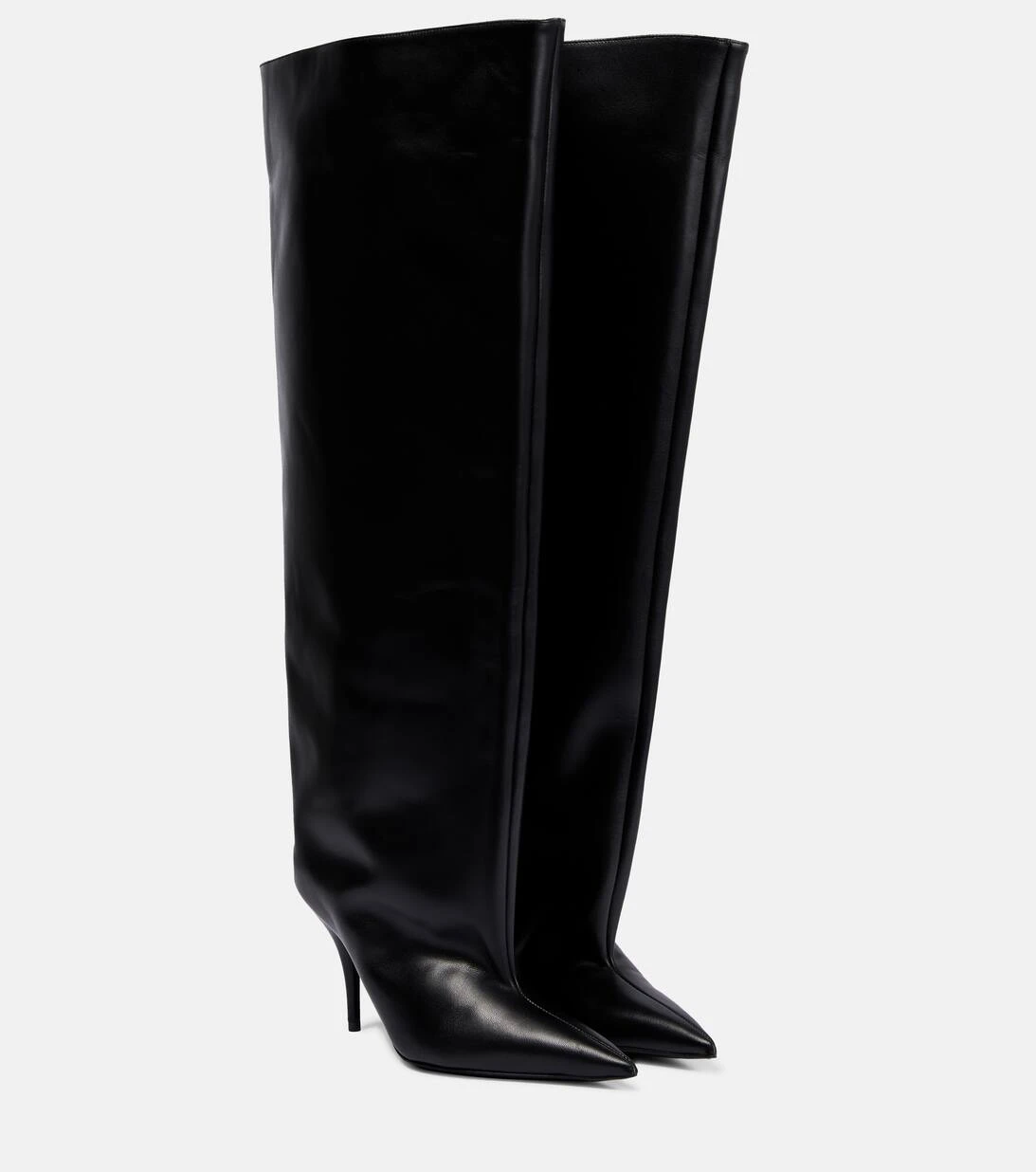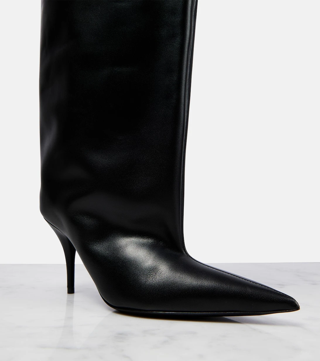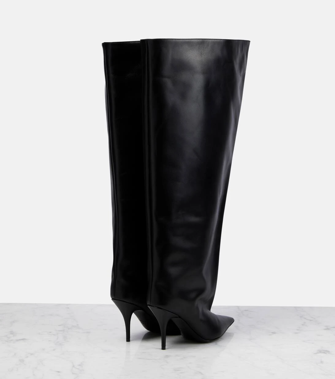Balenciaga offeriert mit den ausgestellten Waders Stiefeln eine neue Perspektive auf klassische Silhouetten. Das in Italien aus Kalbsleder gefertigte Modell zeichnet sich durch einen breiten, kniehohen Schaft aus, der sich zu spitzen Absätzen und Zehen verengt, wodurch er an ein umgekehrtes Dreieck erinnert.