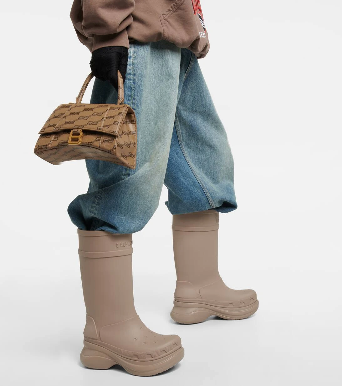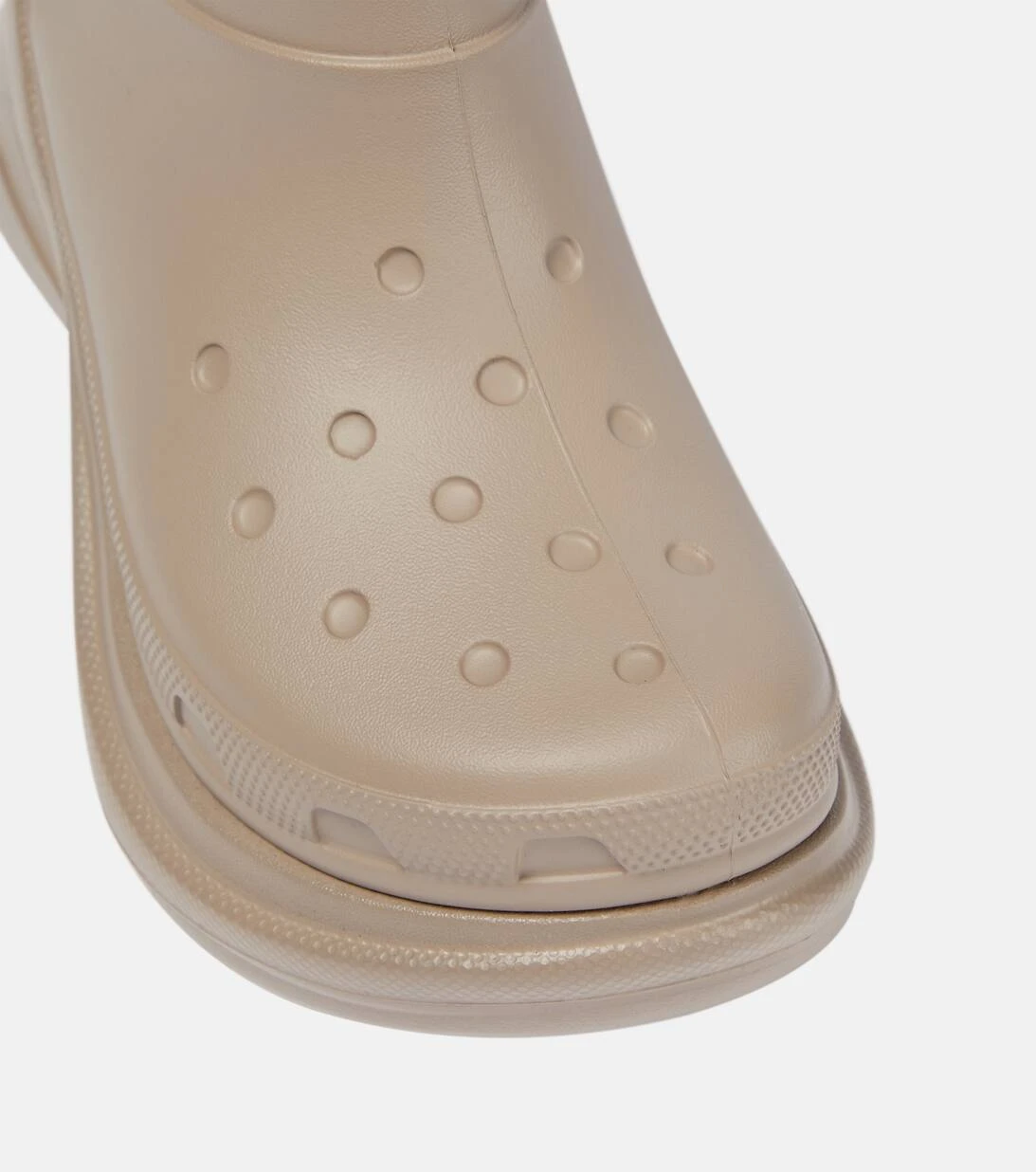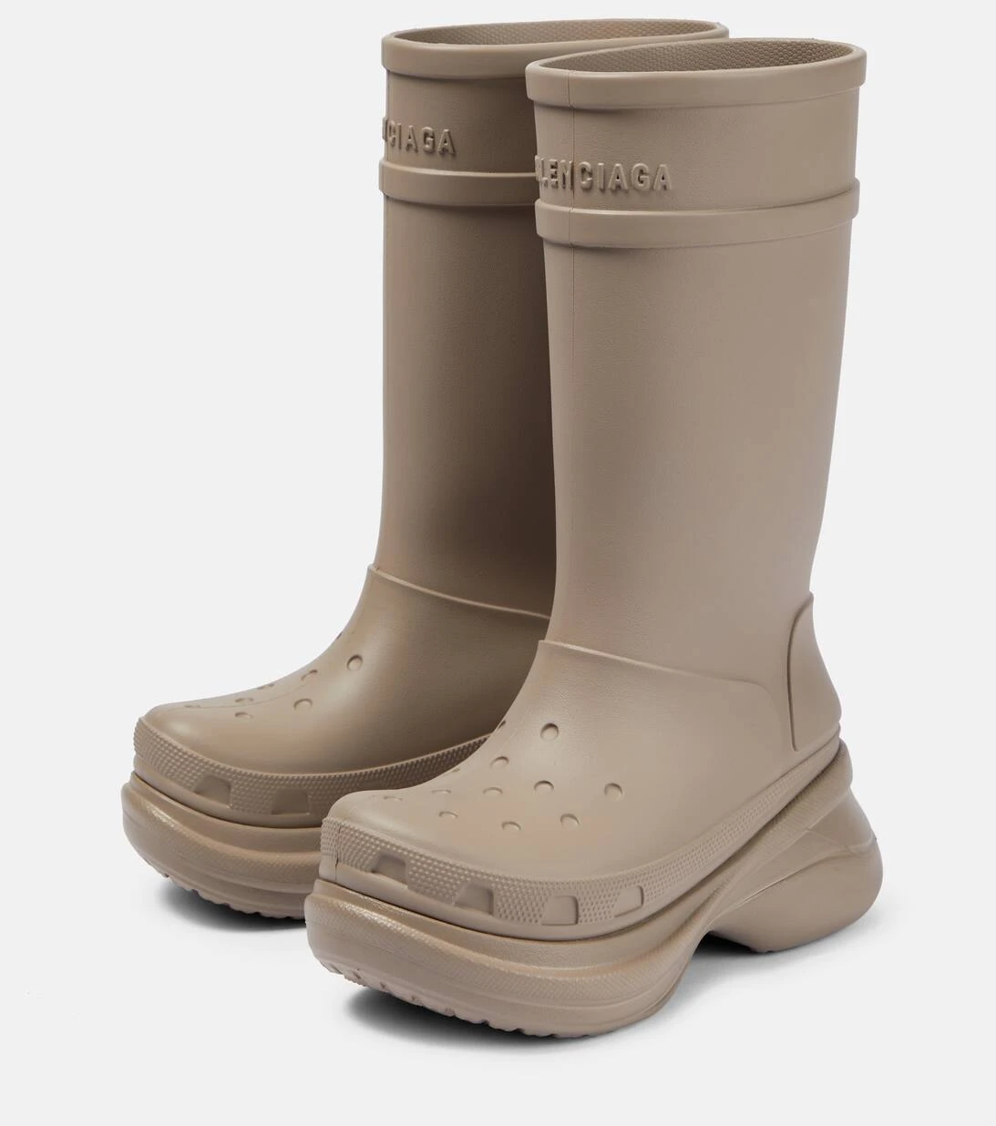 Diese Stiefel aus der Kollaboration von Balenciaga mit Crocs stehen für die experimentelle Seite des Hauses. Das Modell mit runder Zehenpartie verfügt über geprägte Crocs-Belüftungslöcher auf dem Obermaterial aus Gummi und geprägte Balenciaga-Logos am Schaft.