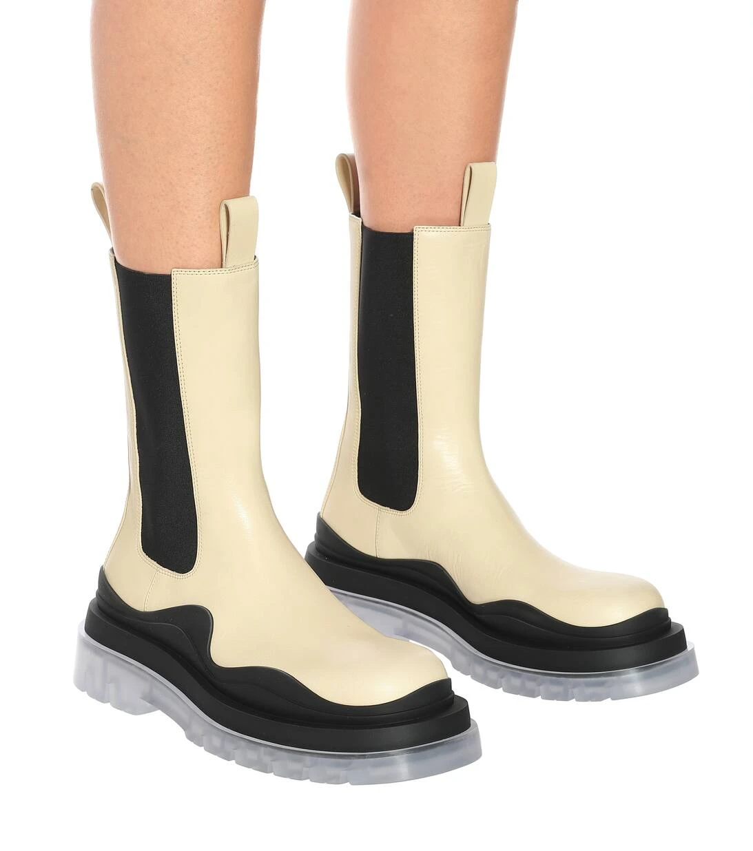Ganz oben auf unserer Wishlist: Die BV Tire Stiefel von Bottega Veneta. Das Paar wurde in Italien aus cremefarbenem sowie schwarzem Glattleder gefertigt und mit einem langen, schmalen Schaft versehen. Es ruht auf einer markanten Plateausohle aus semitransparentem Gummi und lässt sich mittels der elastischen Einsätze an den Seiten sowie der Fersenlaschen einfach an- und ausziehen. Tragen Sie einen Allover-Look des Labels dazu.
