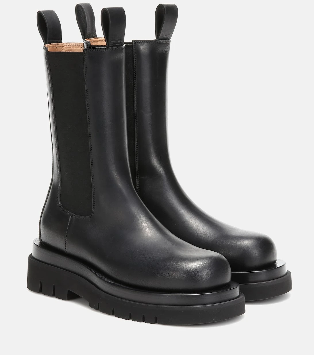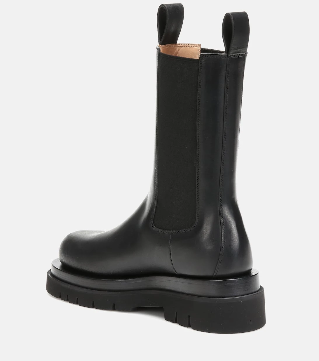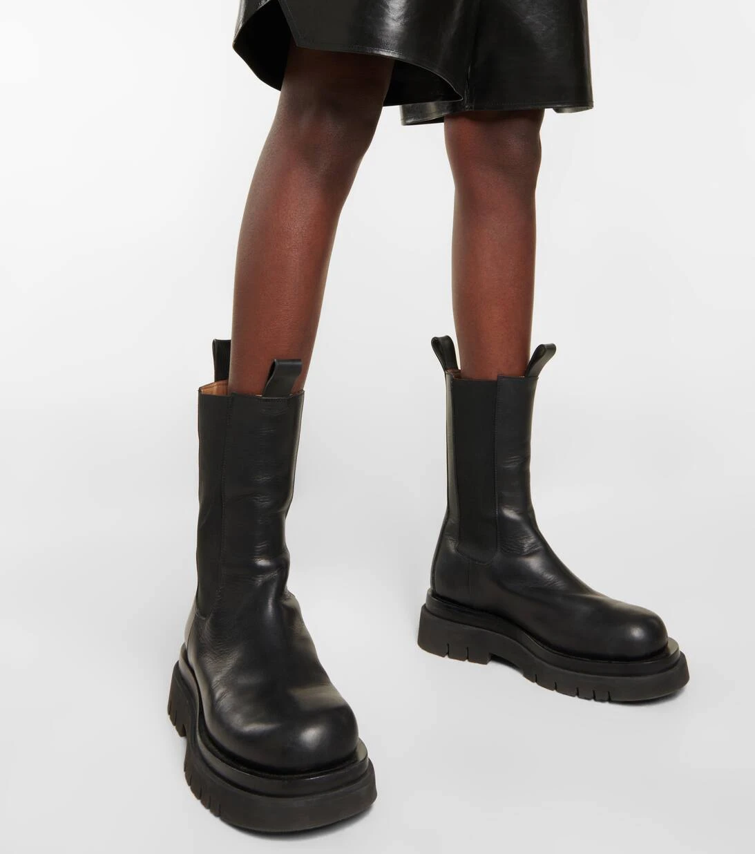 Die schwarzen Lug Stiefel von Bottega Veneta wurden in Italien aus schwarzem Glattleder gefertigt und mit einem langen, enganliegenden Schaft versehen. Das Paar ruht auf einer markanten Plateausohle und lässt sich mittels der elastischen Einsätze an den Seiten sowie den Fersenlaschen einfach an- und ausziehen. Tragen Sie dazu sowohl Cropped Jeans als auch fließende Midiröcke.