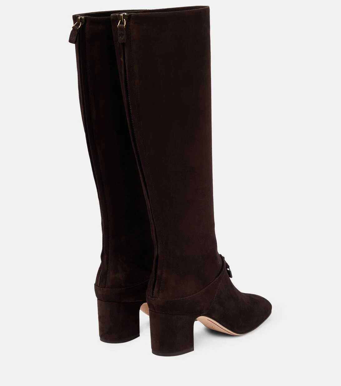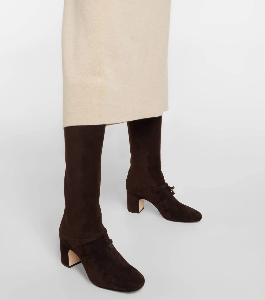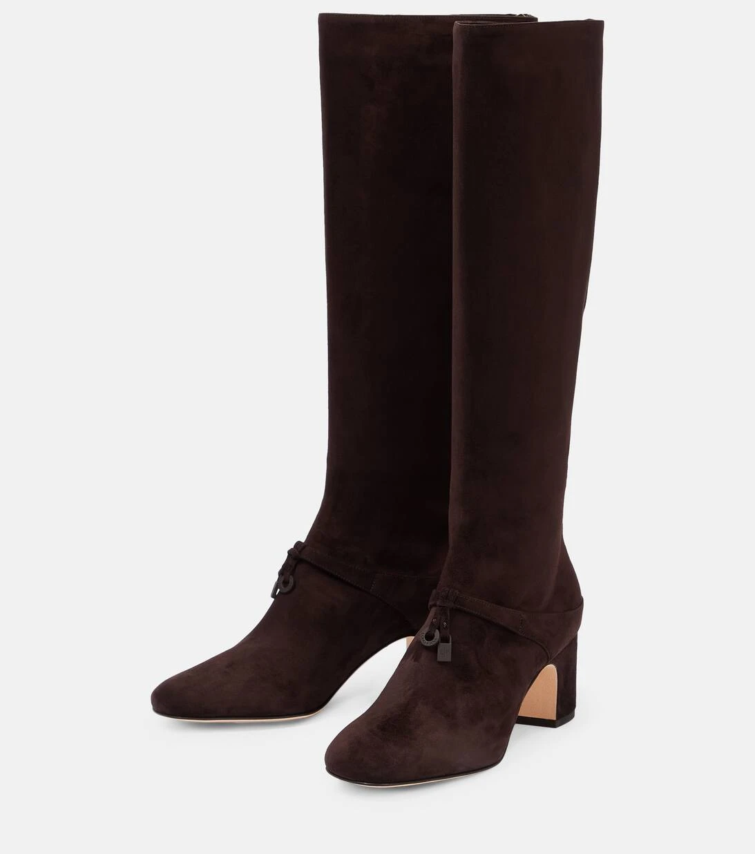 Die Maxi Charms Stiefel von Loro Piana sind mit dem namensgebenden Detail auf dem Schuhblatt verziert. Sie wurden aus braunem Veloursleder gefertigt, das mit einem leichten wasser- und schmutzabweisenden Mittel behandelt wurde, um den Style Saison für Saison zu schützen.