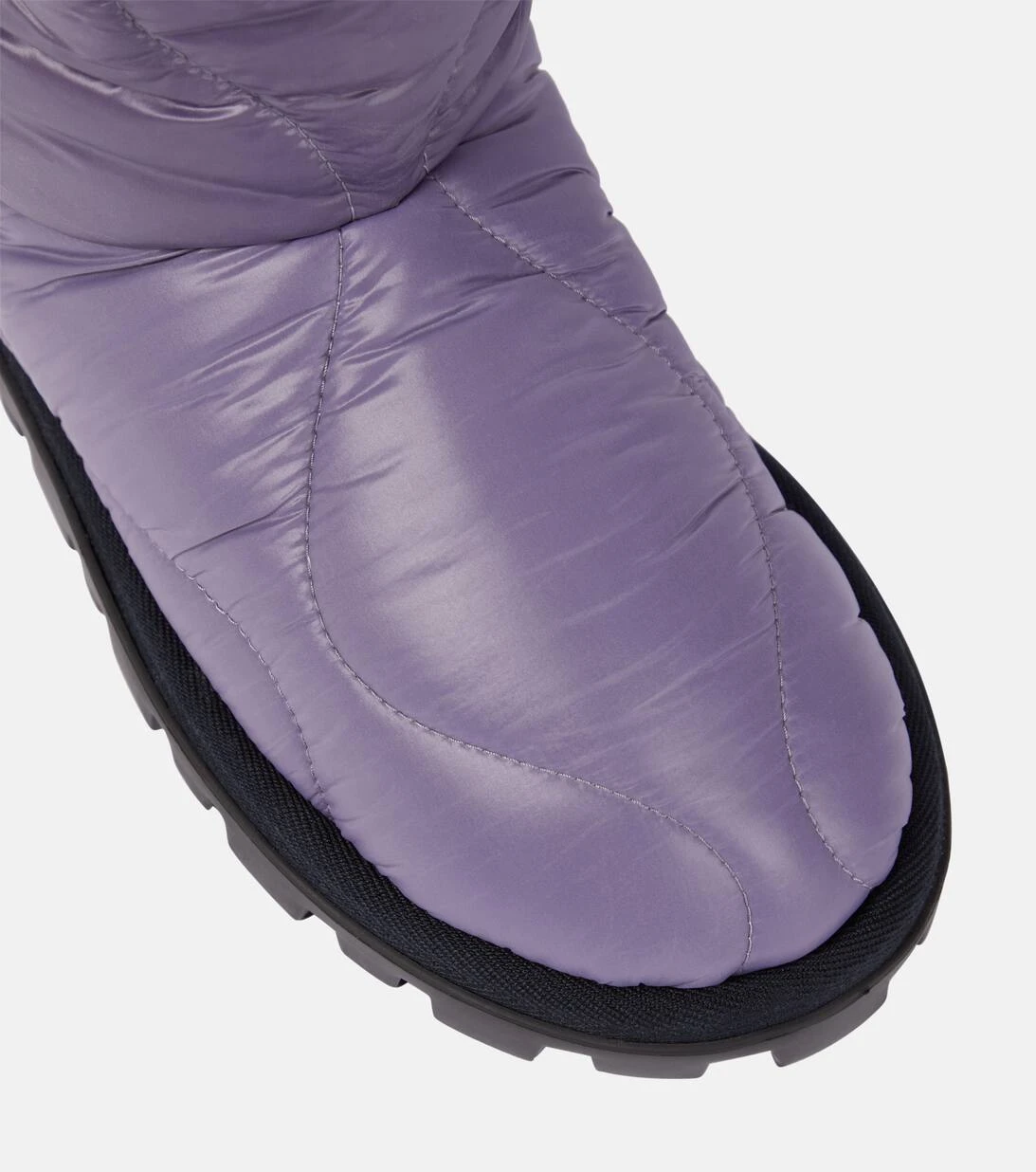 Miu Miu zeigt mit diesen Stiefeln seine berühmte unkonventionelle Opulenz. Sie sind aus gepolstertem, gestepptem Nylon gefertigt und verfügen über ein herausnehmbares Fleece-Futter sowie einen Kordelzugverschluss für optimale Isolierung und versprühen einen sportiven und zugleich luxuriösen Charme.