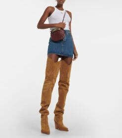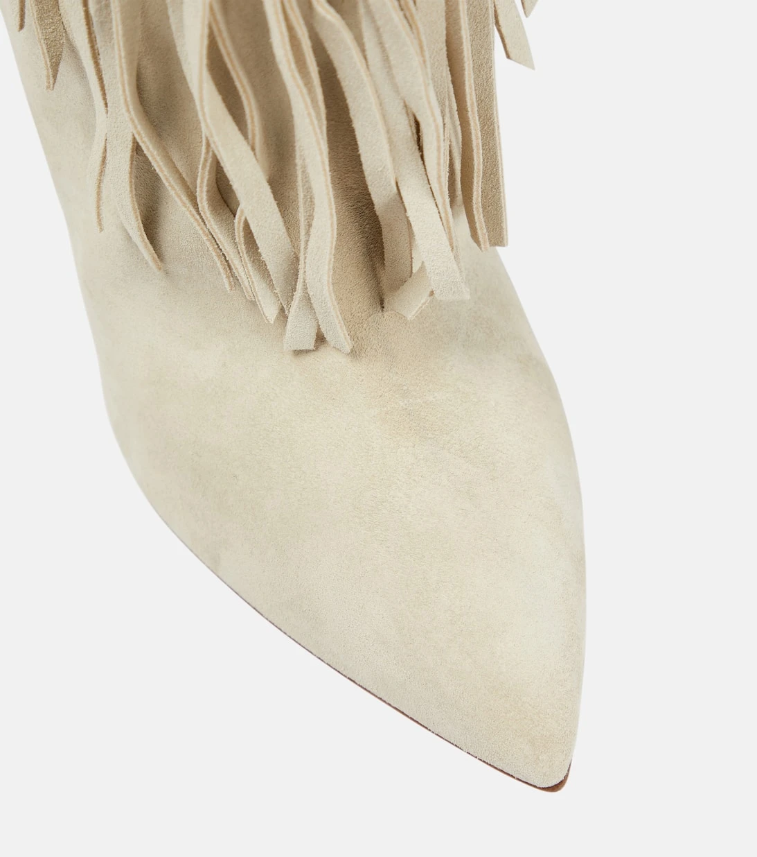 Diese Stiefel von Paris Texas sind ein modernes Design mit Retro-Flair. Sie wurden aus beigefarbenem Veloursleder gefertigt und beeindrucken durch eine spitze Zehenpartie und Fransendetails, die an einen Western-Stil erinnern.