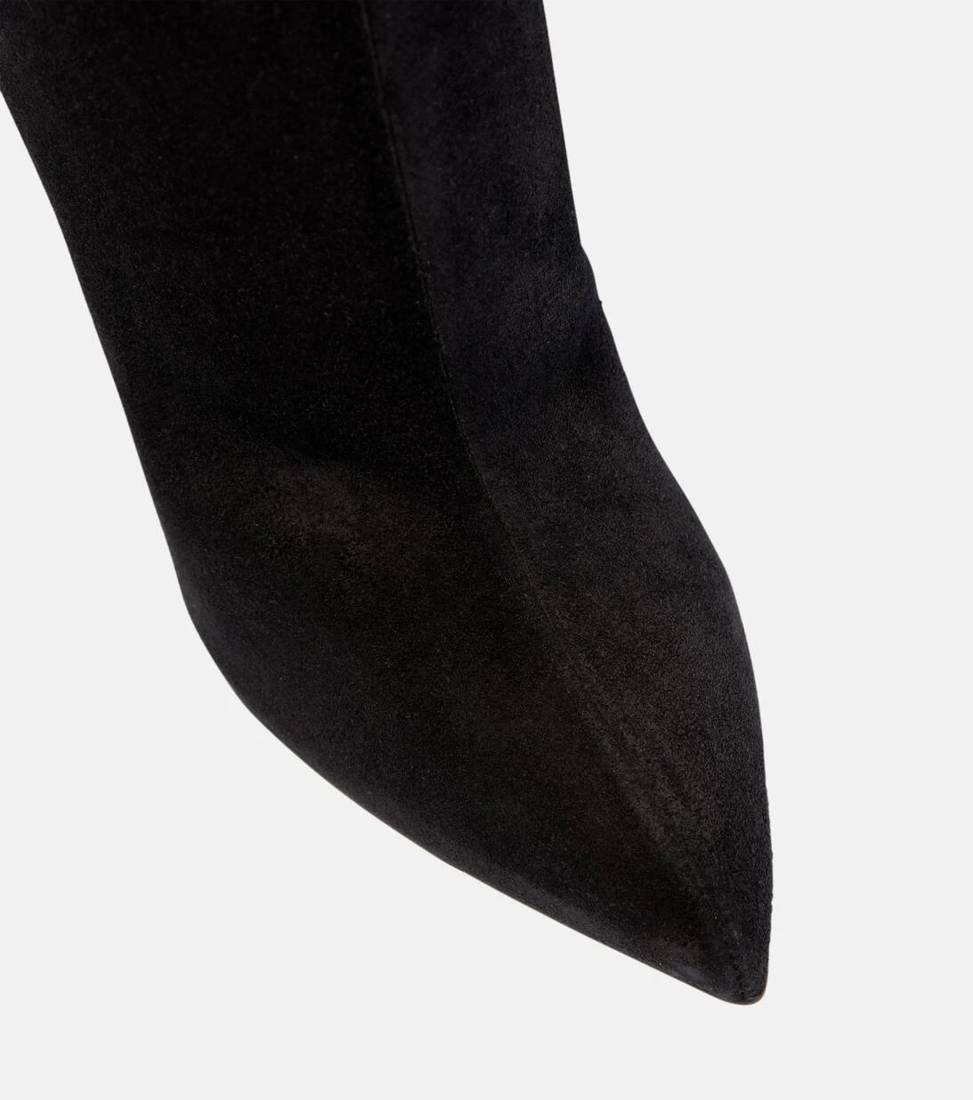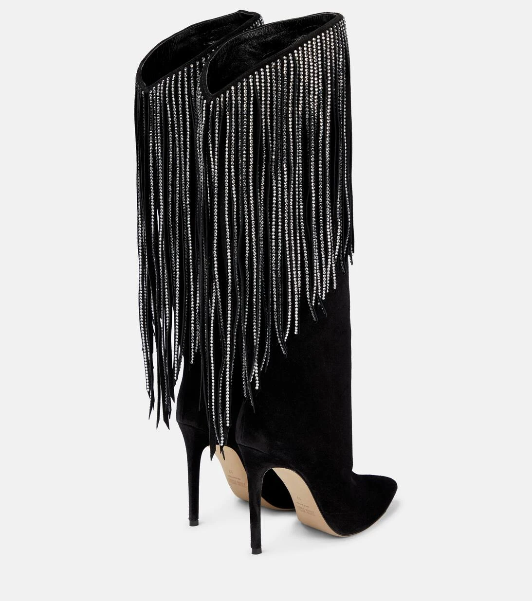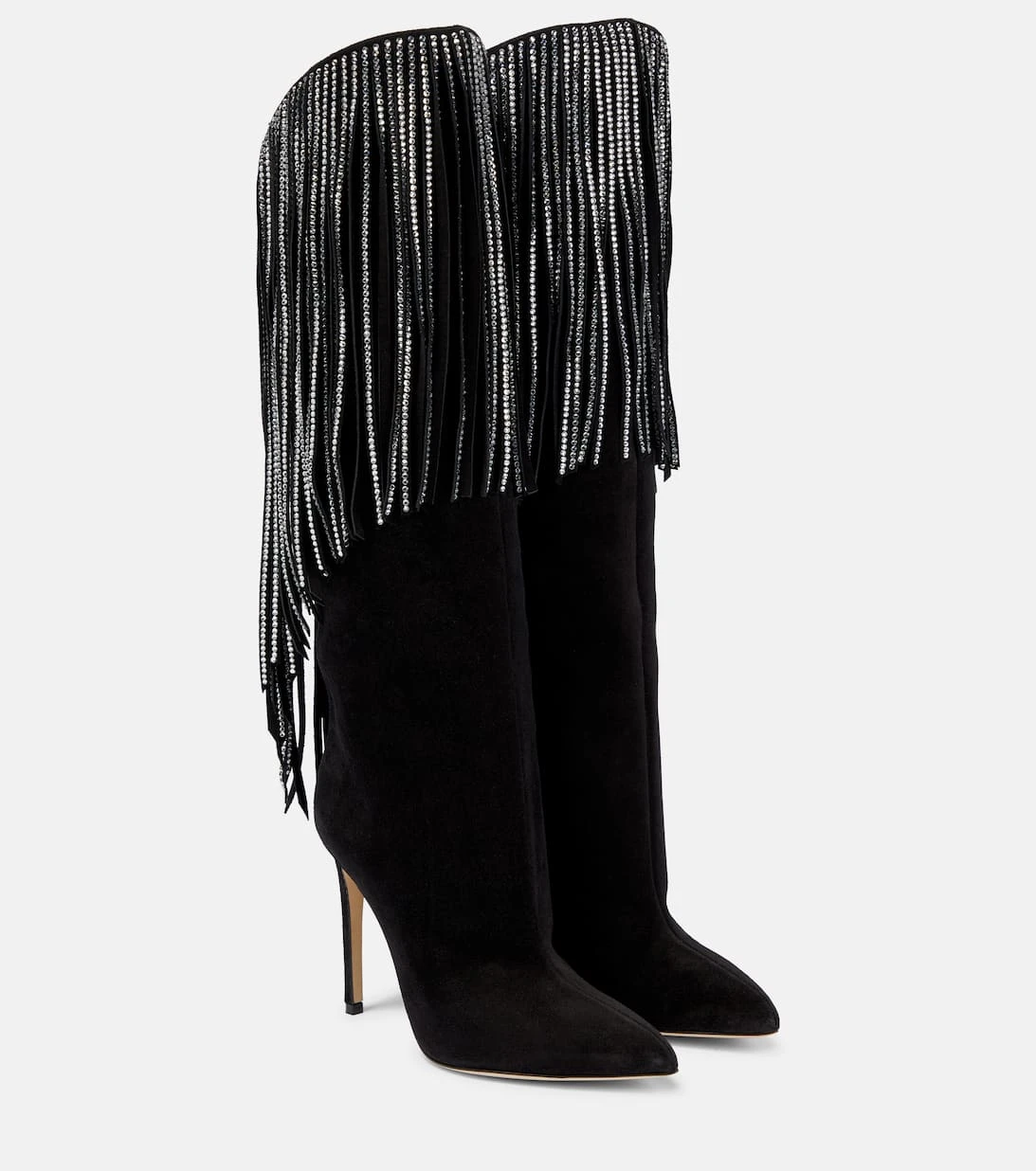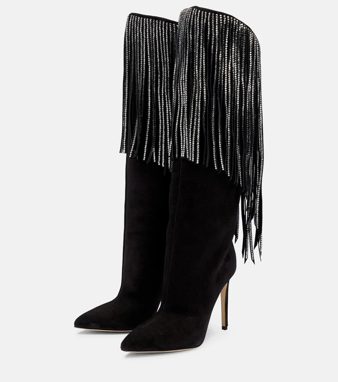 Auffällige Looks lassen sich auf einfache Weise mit diesen Stiefeln von Paris Texas kreieren. Das Paar wurde aus schwarzem Veloursleder zu einer kniehohen Silhouette gefertigt und wird durch kristallbesetzte Fransen am Schaft vollendet.