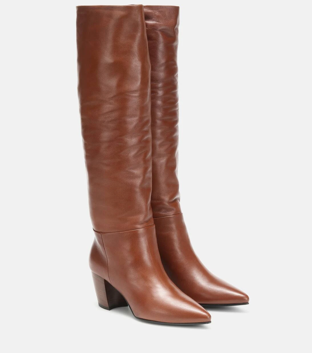 Pradas kniehohe Stiefel wurden aus besonders weichem Lammleder in Italien gefertigt und stellen mit ihrem Braunton einen echten Klassiker dar. Dabei besteht das Paar aus spitzer Zehenkappe, einem Sloughy-Schaft und halbhohem Block-Heel. Kombinieren Sie kurze Kleider oder Röcke dazu, um dem Design die volle Aufmerksamkei zu geben.
