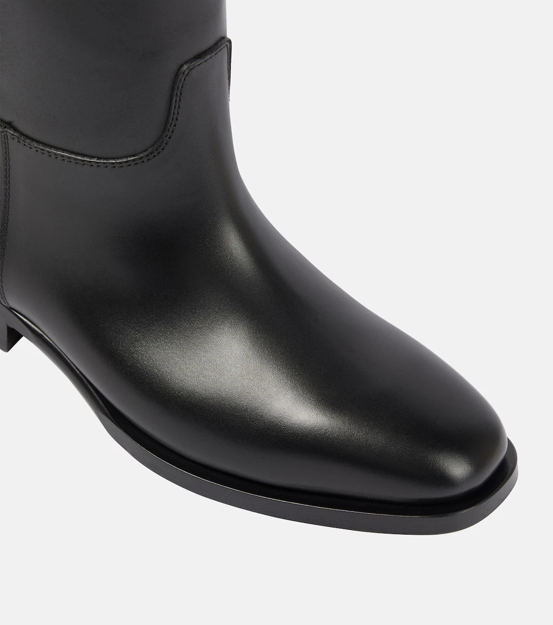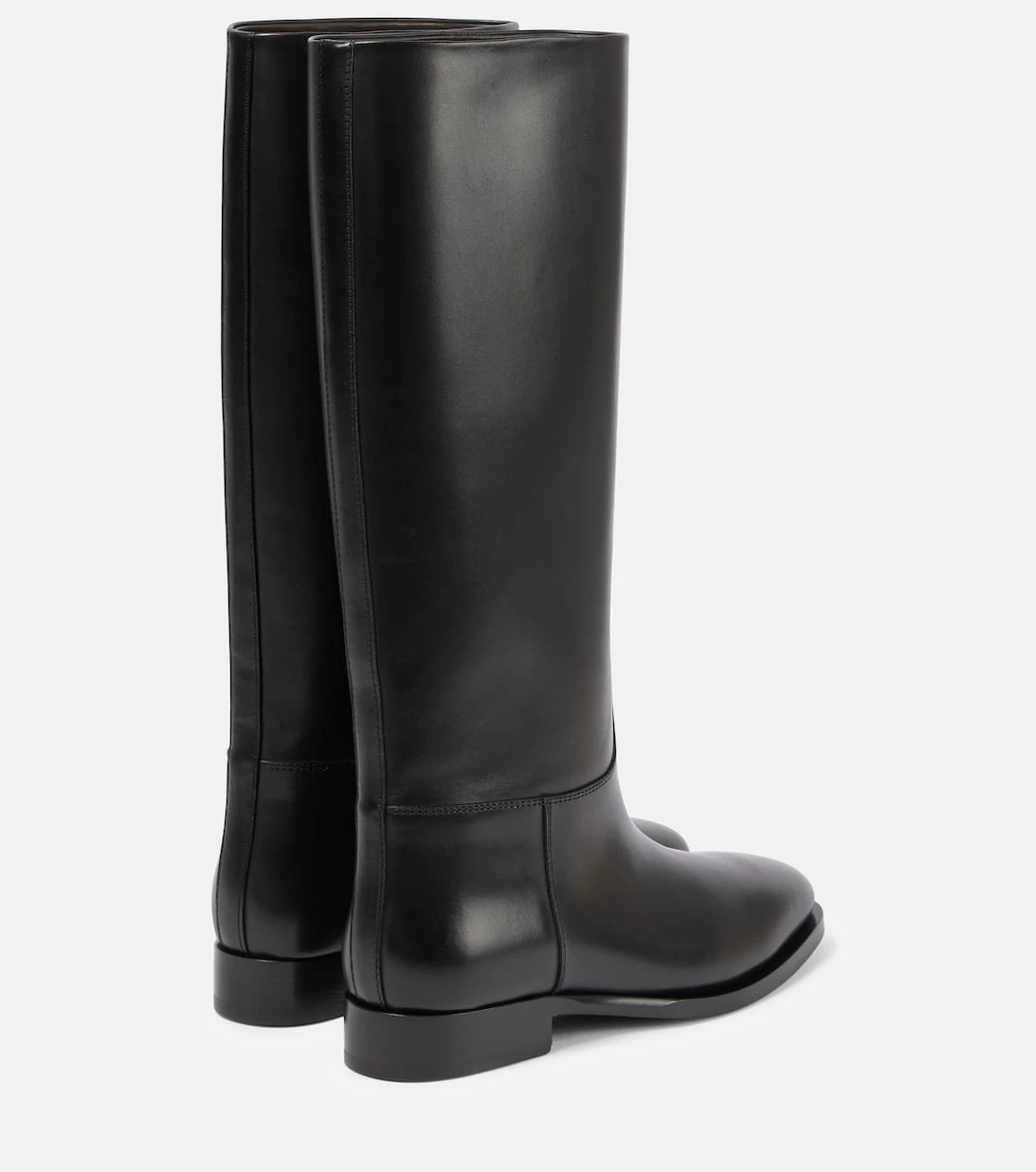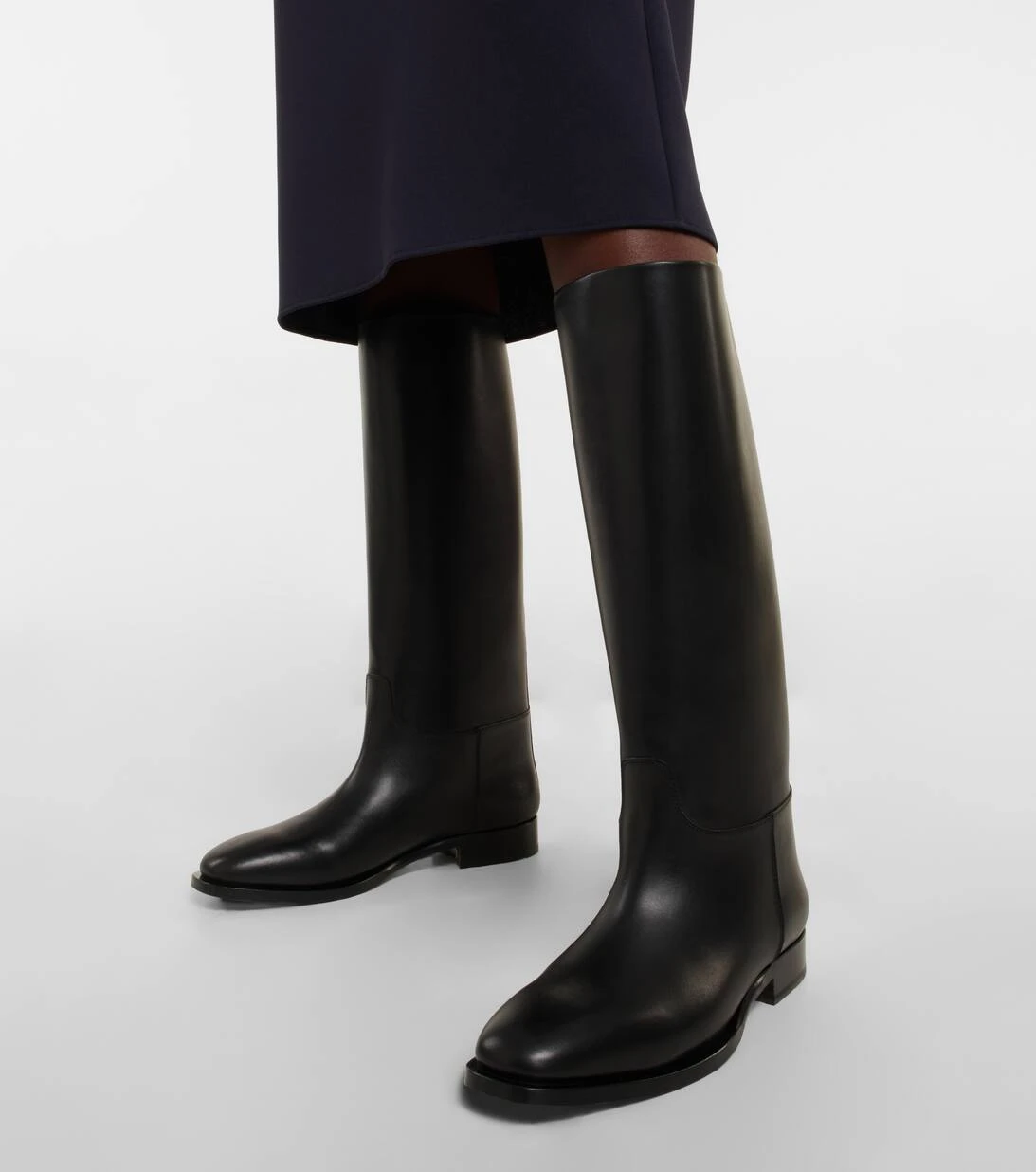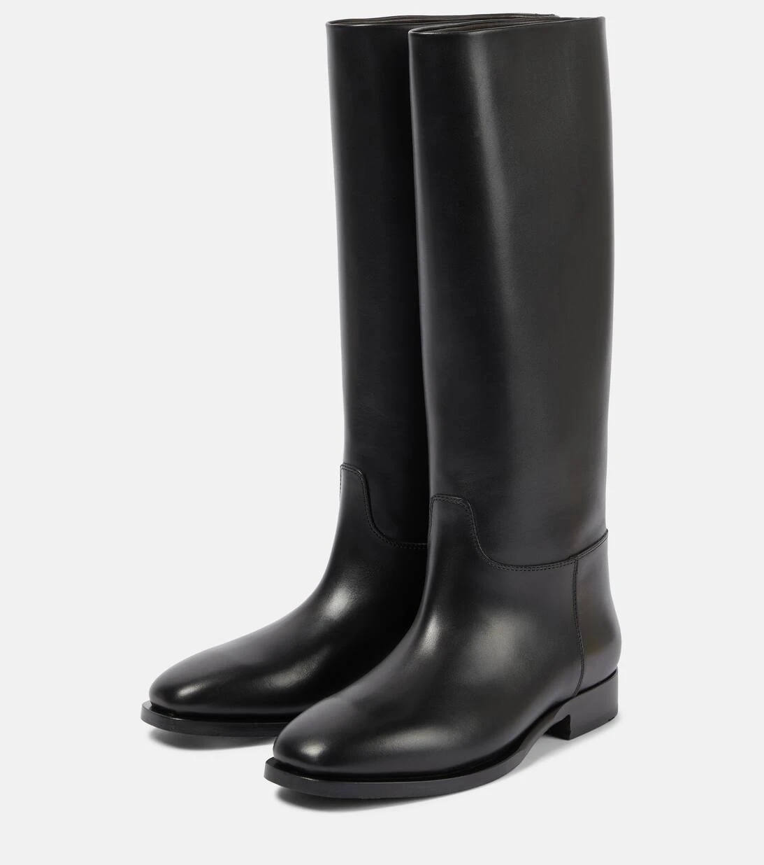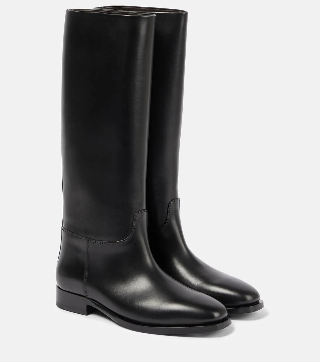 Die kniehohen Grunge-Stiefel von The Row sind vom Reiter-Stil inspiriert. Sie wurden aus poliertem Leder gefertigt und mit einem niedrigen Blockabsatz versehen.